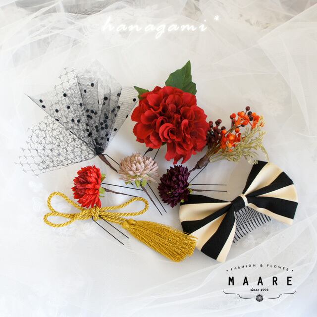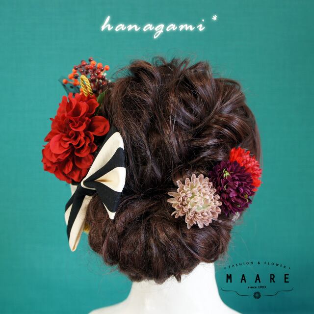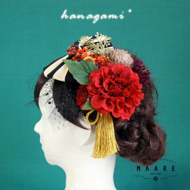 *〜ko-en〜*赤ダリアとストライプリボンの髪飾り