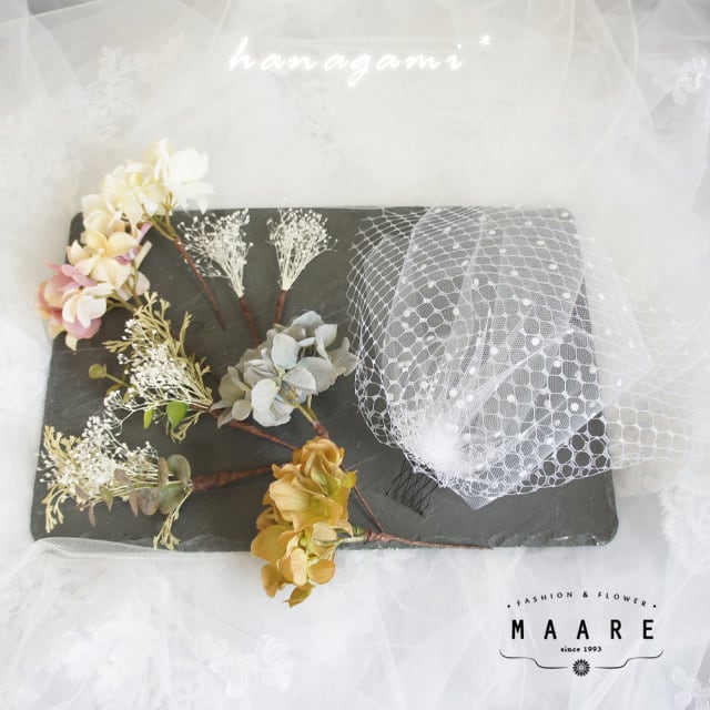 コームのついたチュールは無地・ドット・ネットチュールの3層になっており、後ろに垂らしたり、前にもってきたりと、自由自在にお使い頂けます。