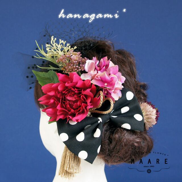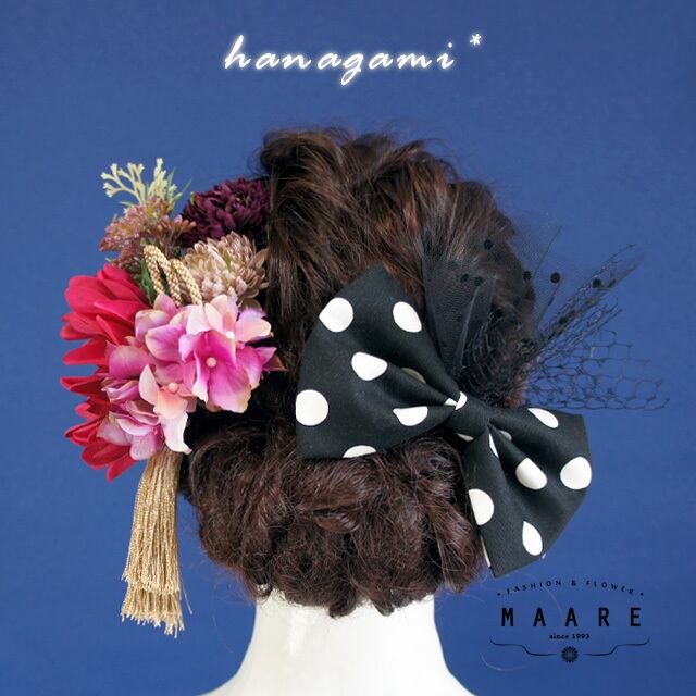 さらに、ドットチュール、ドットリボン、タッセルを添えてヘアスタイルを華やかに演出**