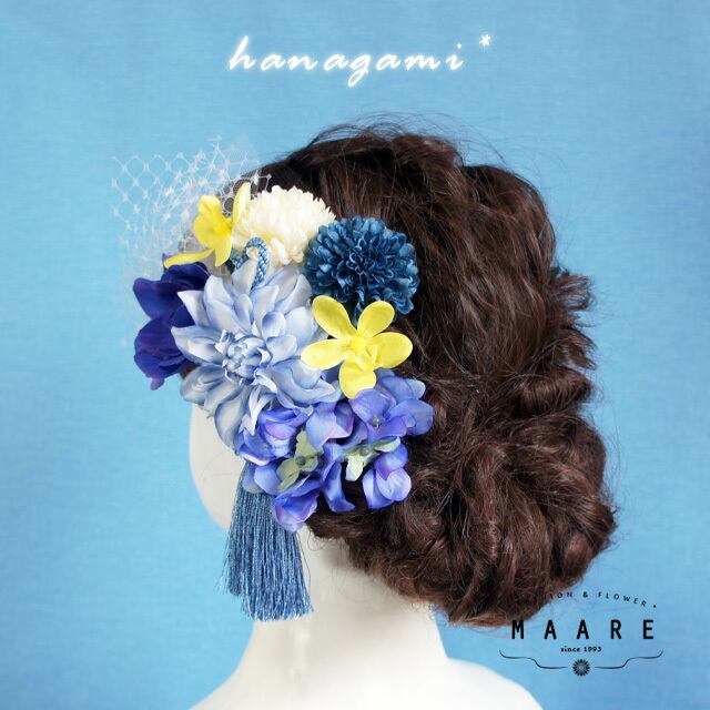 **Blue gradation** アネモネとダリアの髪飾り