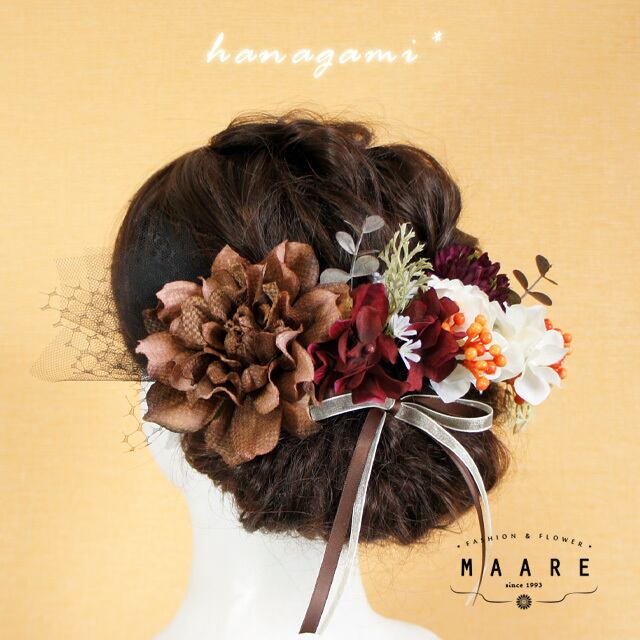 ダークな色合いのブラウンのダリアを主役に紫陽花、マム、実、小花...♪*