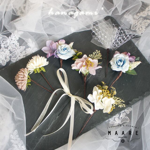 ピンの部分は曲げて使用することもできますので、お花の角度などを調整することができます。