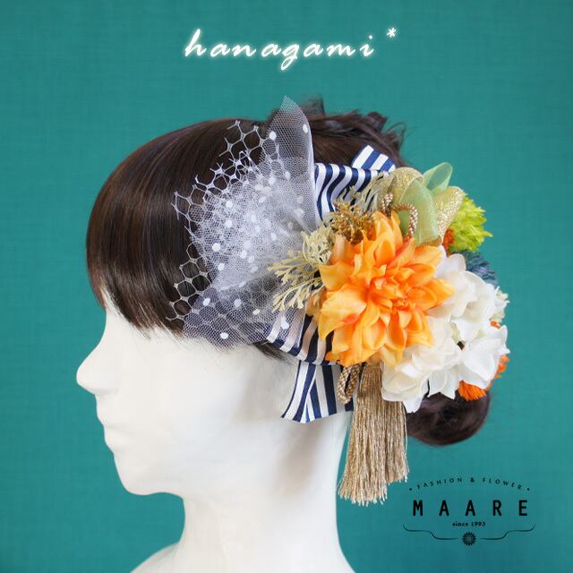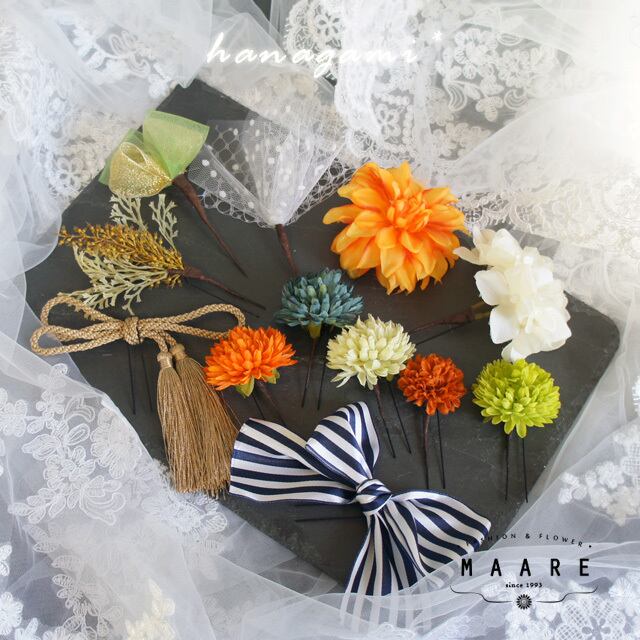 リーフやオーガンジーリボンが、ナチュラルなアクセント。緑・オレンジ色の装いにピッタリです♪*