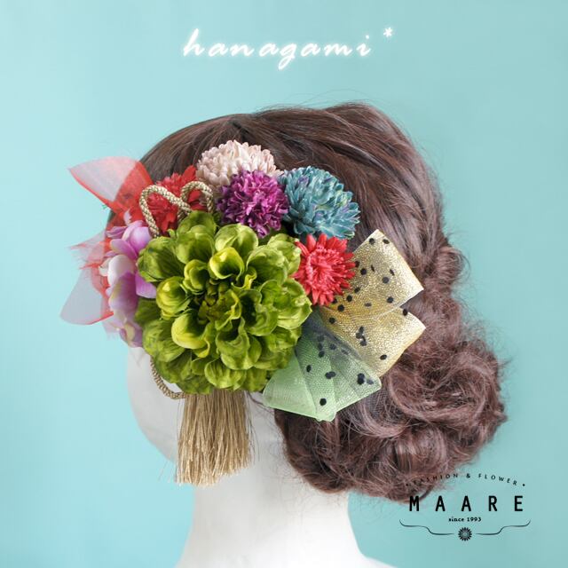 緑のグラデーションダリアをメインに、赤やピンクを合わせて♡