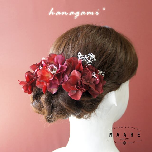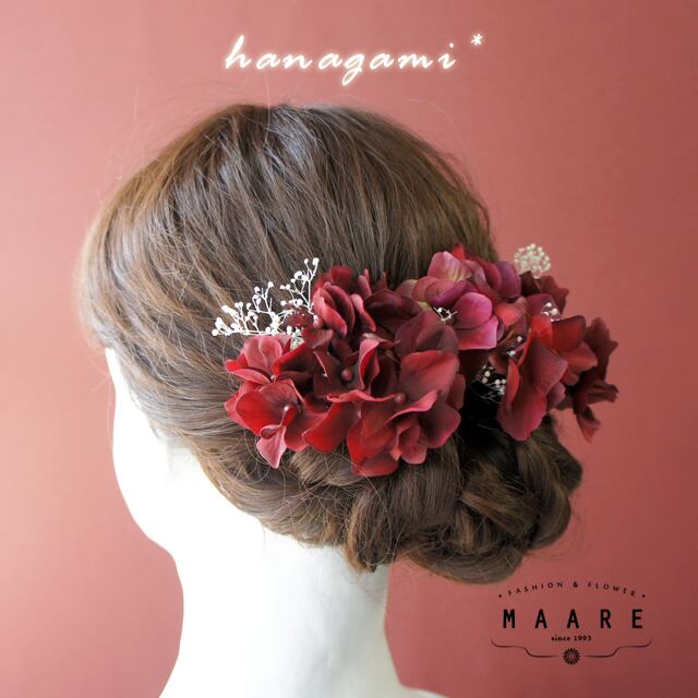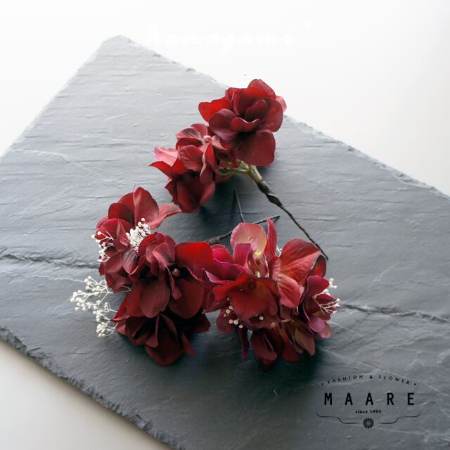 深い赤の紫陽花からカスミソウがちらりと覗く、素敵なヘッドドレスができました♪*