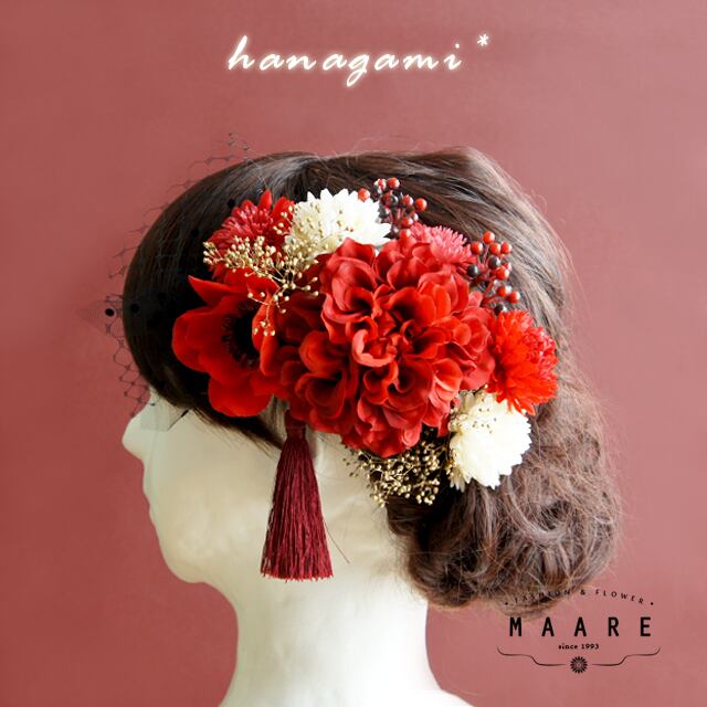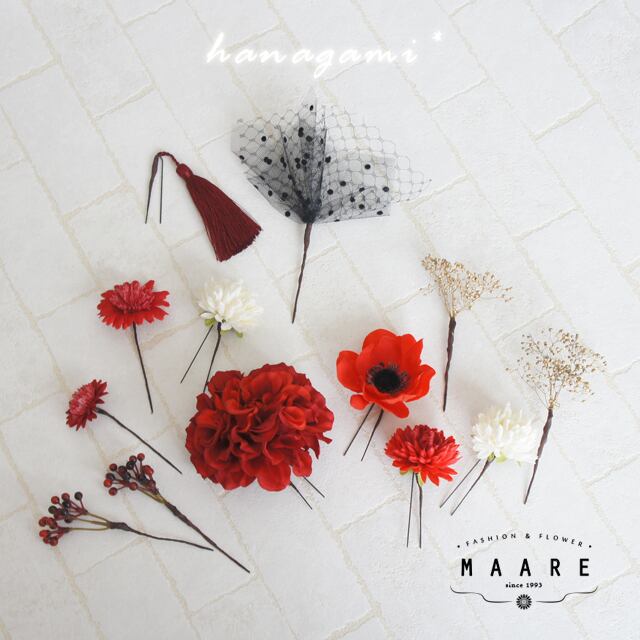 *a n e m o n e* 紅白とゴールドのお花の髪飾り